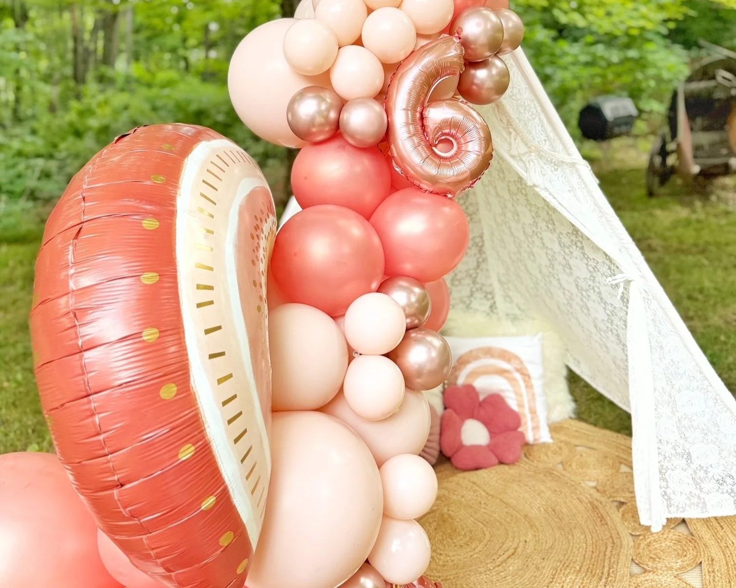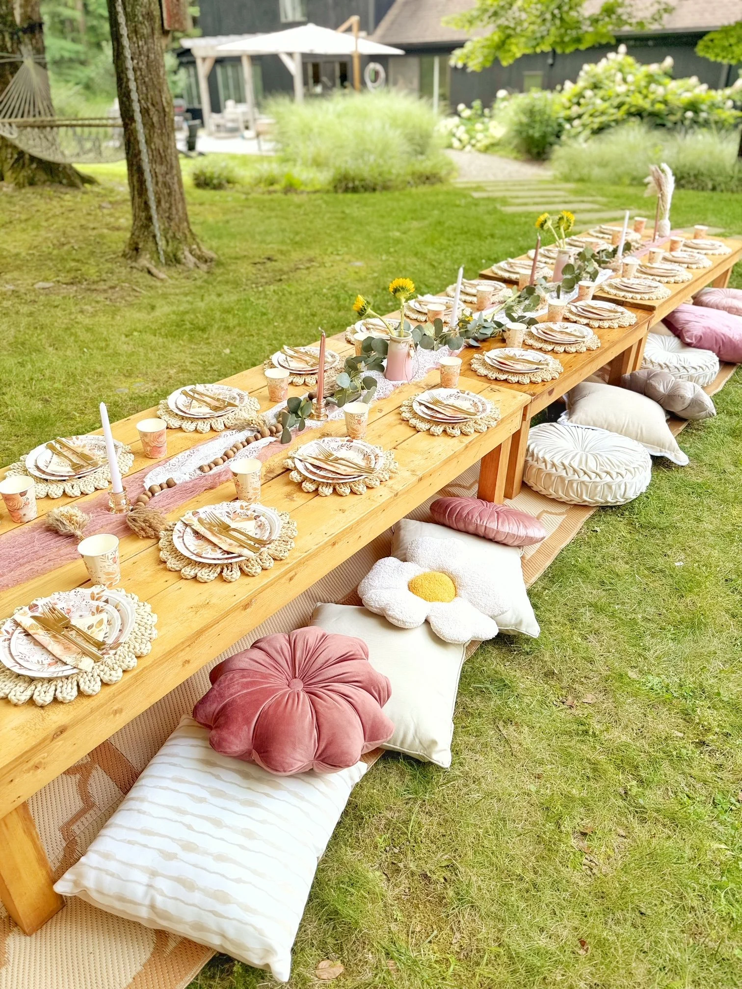 Our picnic rentals include a 7 ft. XL Lace Teepee and our tables come set with a mix of comfortable outdoor cushions and pillows, charger plates, drinking glasses and place settings, along with all of the functional themed décor impeccably decorated on our low-profile picnic tables.