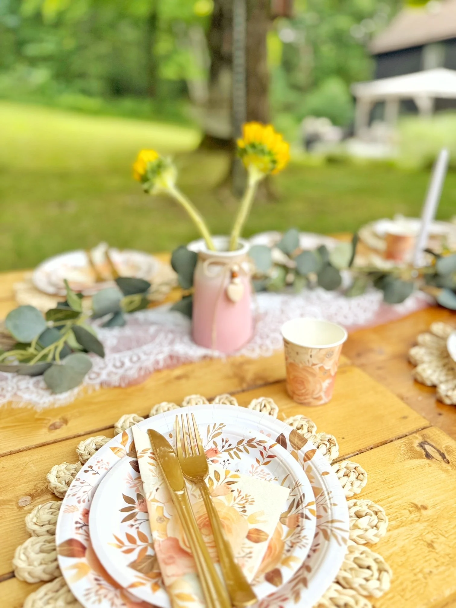 Outdoor picnic setup with table decorated for a party, featuring colorful plates, utensils, and napkins. A white lace teepee and pillows are in the background. A wooden fence and lawn are visible, creating a serene setting.